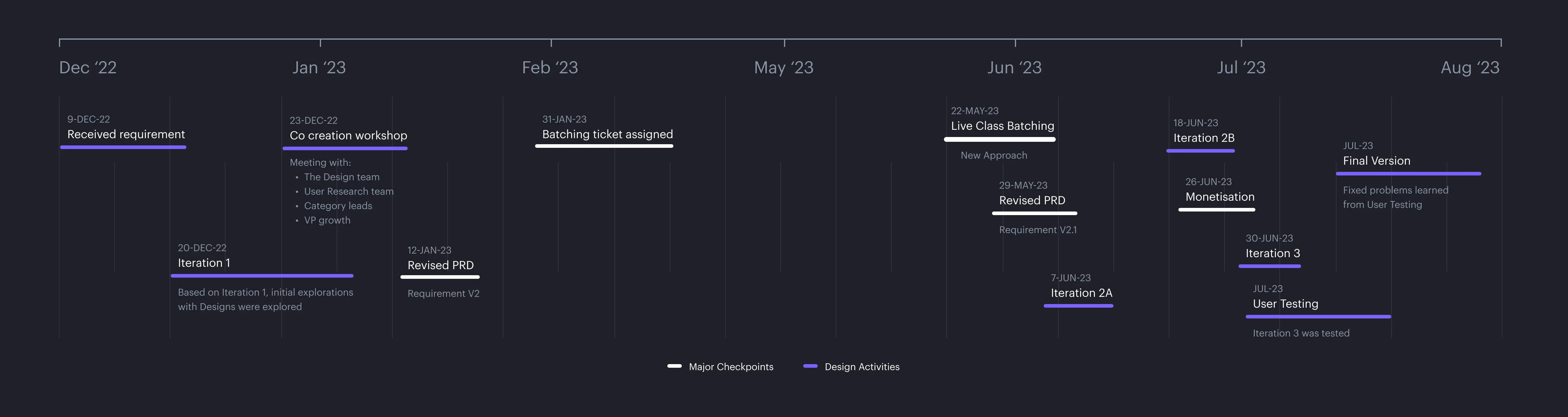 We transformed the current system of Live Classes to support batch-based courses that can be bought as a package, ensuring a seamless purchasing process for students.